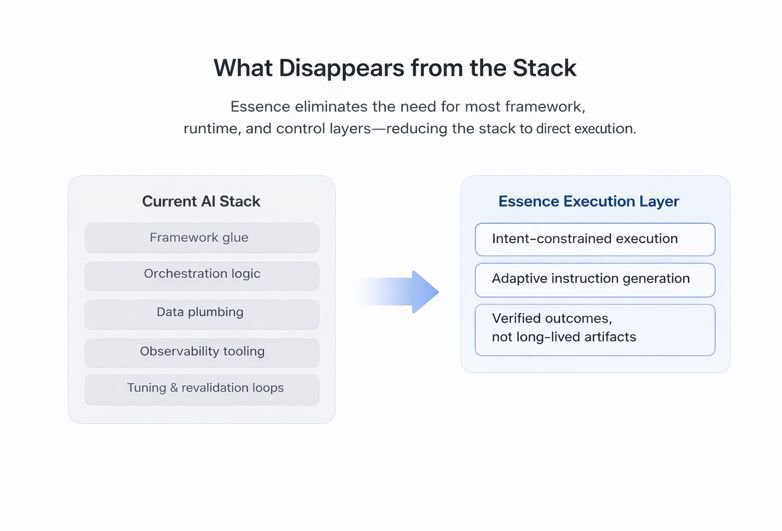 Traditional stacks accumulate binaries, configurations, policies, and logs that must be interpreted after the fact. By operating at the execution layer, Essence reduces reliance on artifacts whose behavior must be inferred rather than verified.
