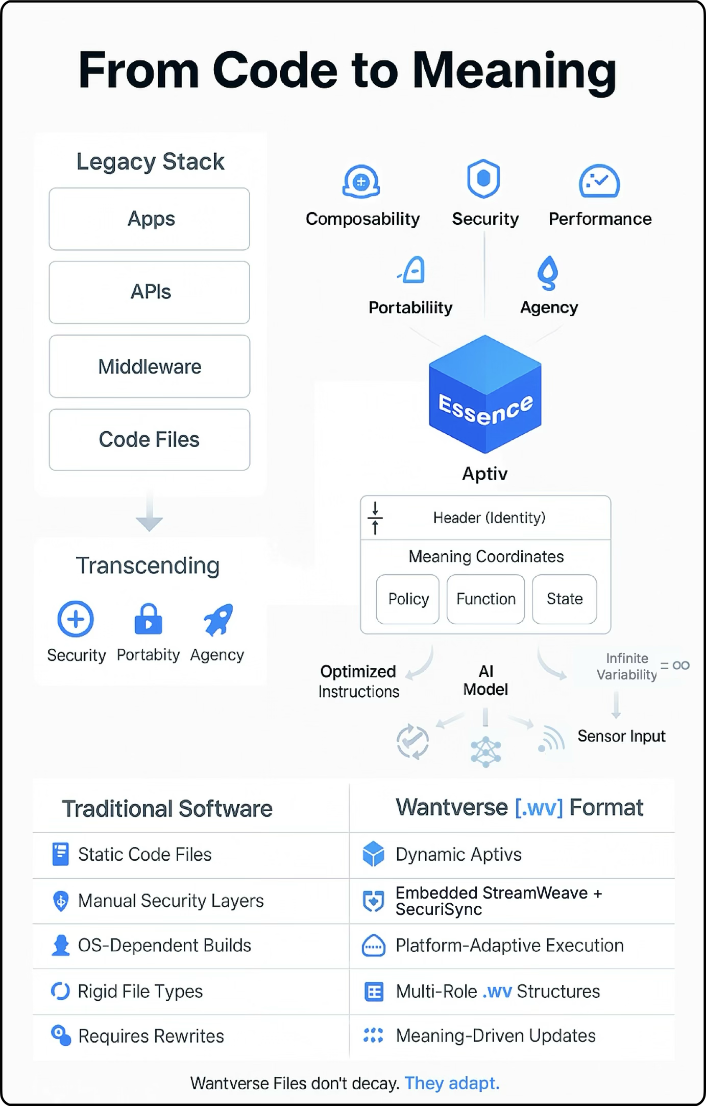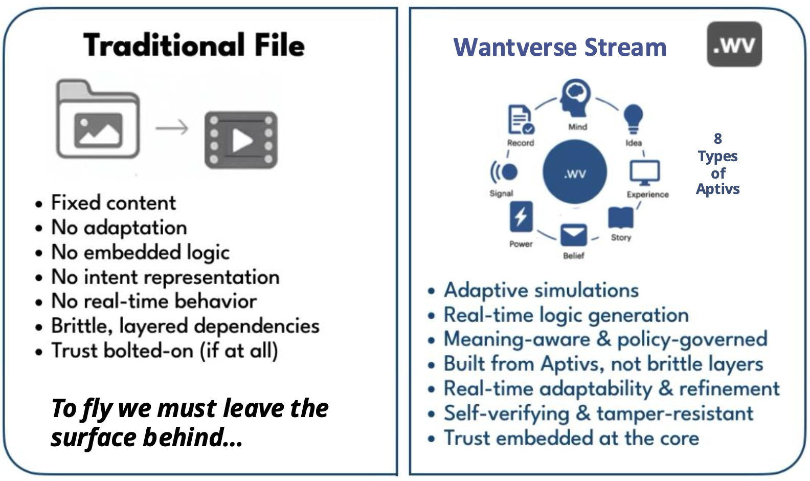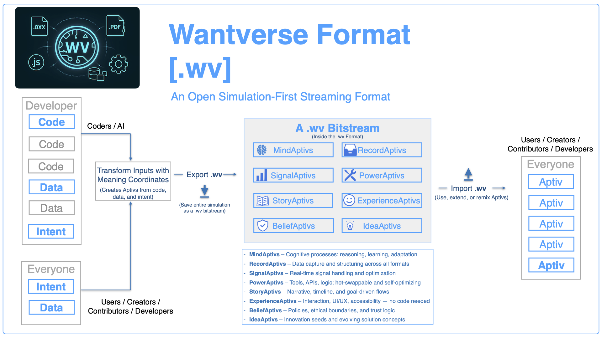 The Wantverse [.wv] format introduces a new foundation for computing—one that organizes functionality around meaning rather than code. It is the world’s first simulation-first streaming format. By structuring behaviors into modular, intent-driven components called Aptivs, the format supports adaptive systems capable of responding dynamically to user intent.
