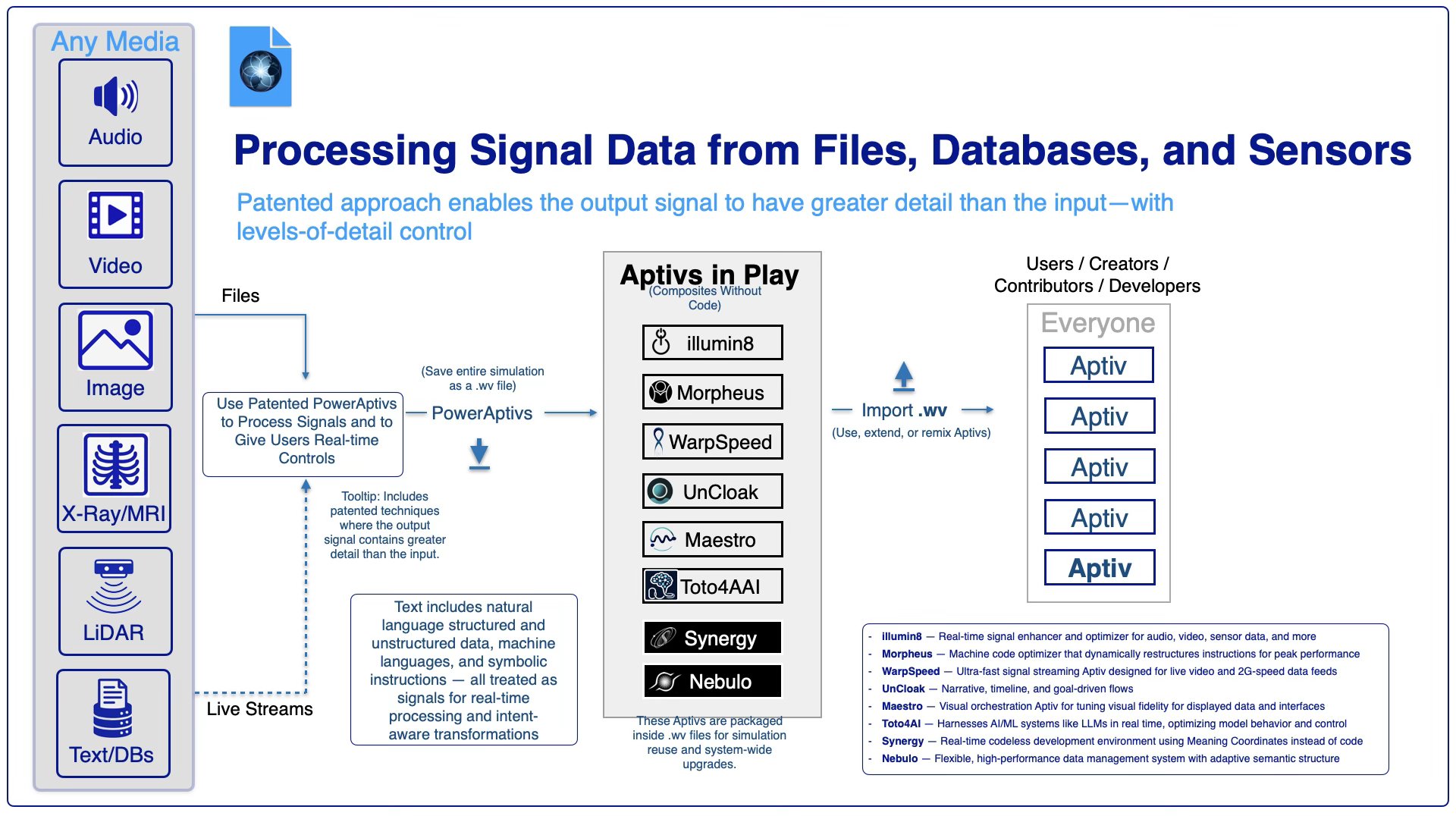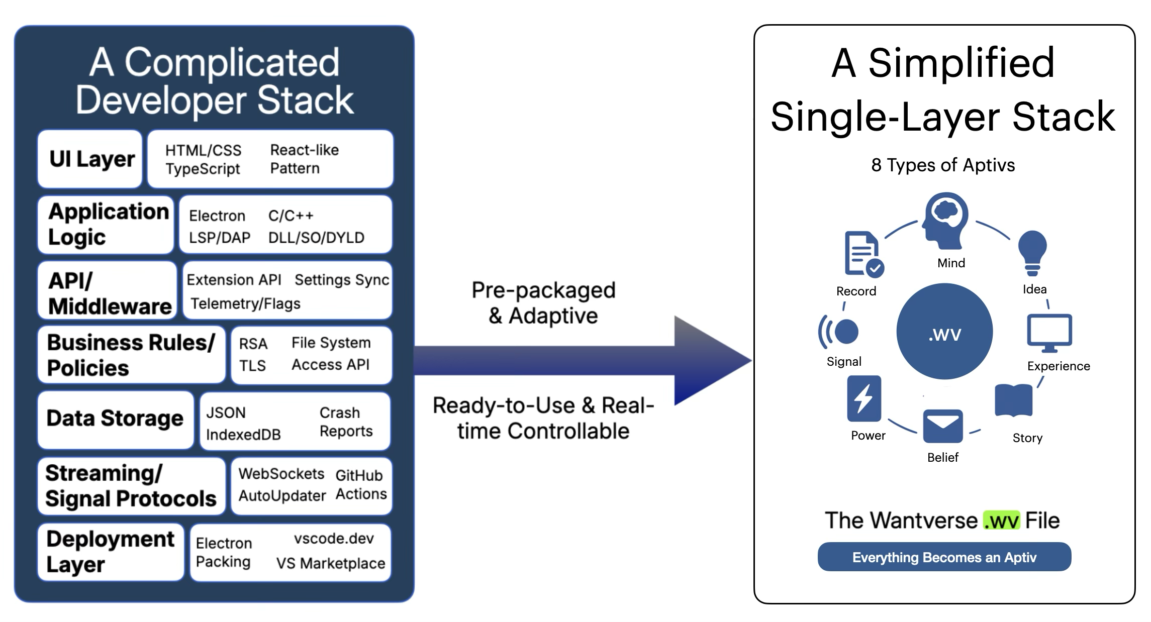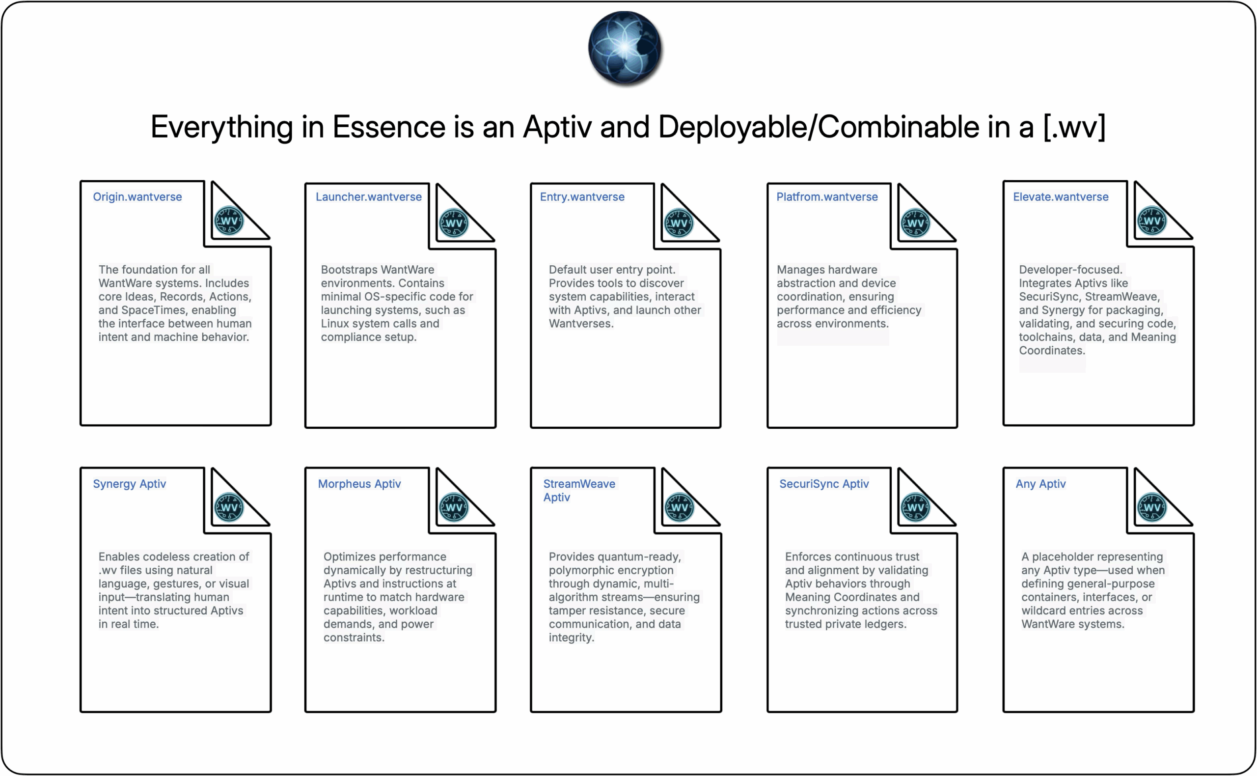 The Wantverse [.wv] format introduces a new foundation for computing—one that organizes functionality around meaning rather than code. It is the world’s first simulation-first streaming format. By structuring behaviors into modular, intent-driven components called Aptivs, the format supports adaptive systems capable of responding dynamically to user intent.