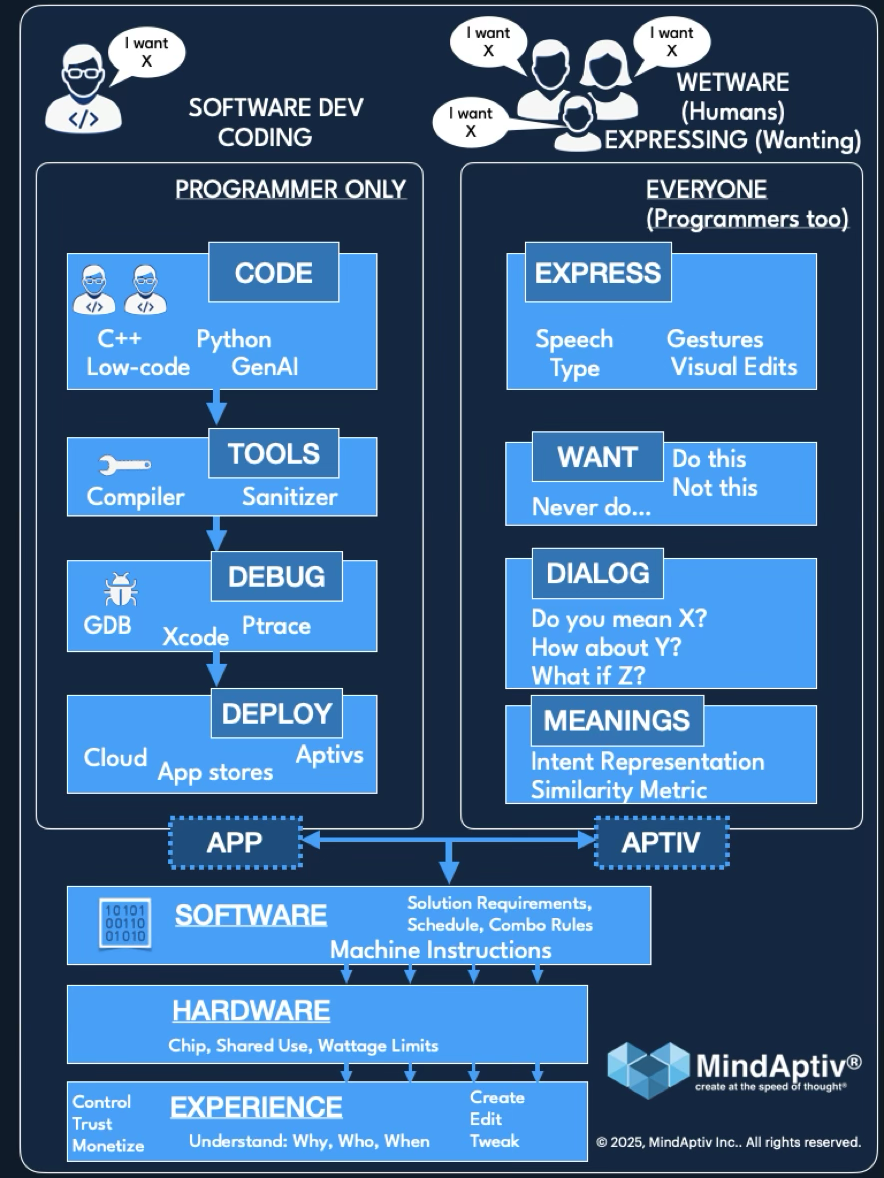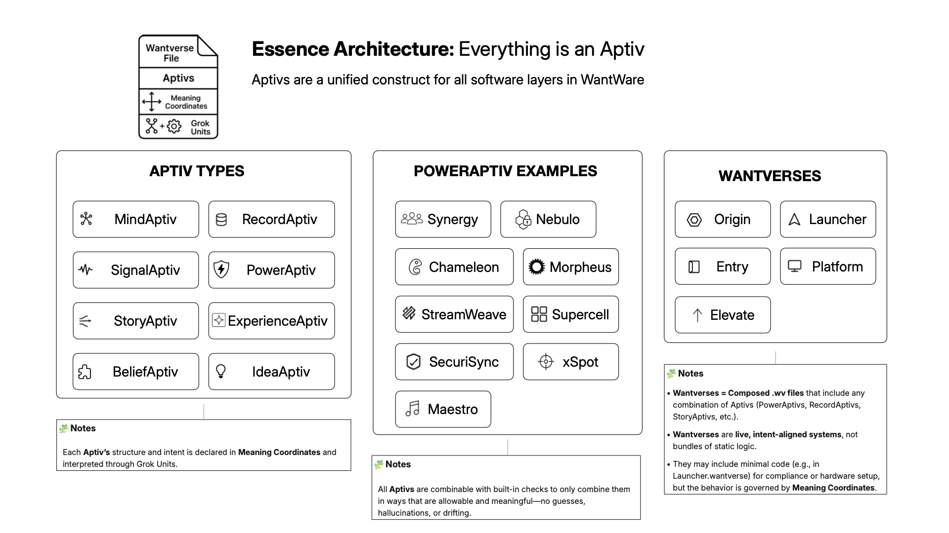 Wantverse [.wv] streams don’t contain code — they contain structured intent. Instead of writing apps, assembling toolchains, or validating prompts, you declare outcomes. Wantware builds composable, secure software units called Aptivs, ready to deploy anywhere.