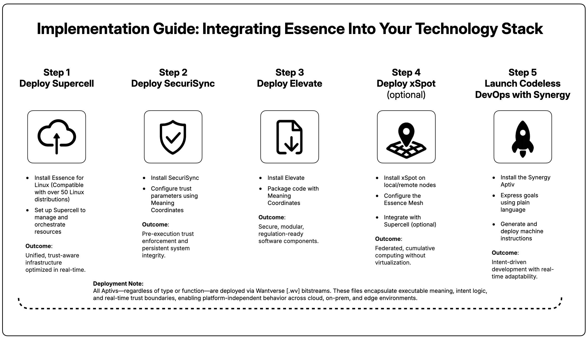 Every deployment of Essence begins with trust. Once the Supercell and SecuriSync Aptivs are active, organizations can package existing workloads using Elevate, extend across federated nodes with xSpot, and move to codeless operations through Synergy. Together, these steps transform brittle, siloed systems into one adaptive, biomimetic computing environment.